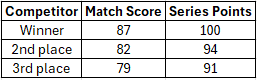 In the example below, the Winner’s score for the match is 87. The winner secures 100 Series Points.